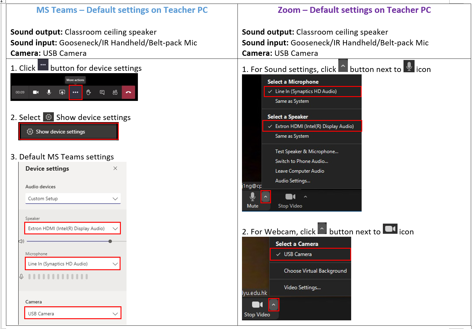 Default settings of audio and web cam on Teacher PC