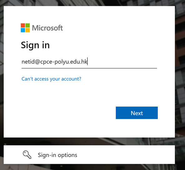 Following the CPCE Single Sign-On (SSO) migration, please input NetID + @cpce-polyu.edu.hk when accessing Microsoft services (e.g., Microsoft Teams) via the Microsoft sign-in page: