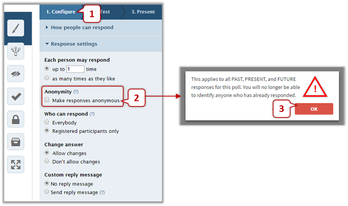 If you want students to respond your polls/surveys anonymously, you can check "Make responses anonymous" under "Anonymity".