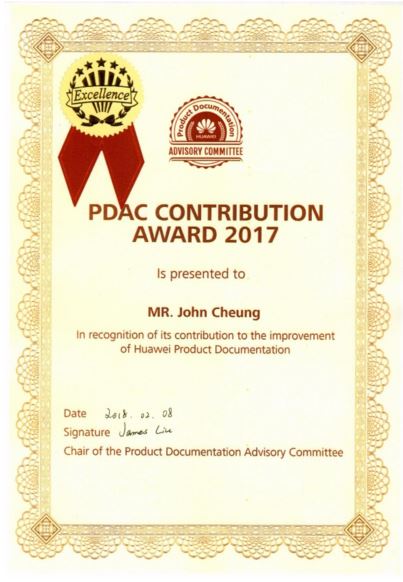 Congratulations to Mr. John Cheung, IT Manager of ITU, who received Huawei's Product Documentation Advisory Committee (PDAC) Contribution Award 2017.