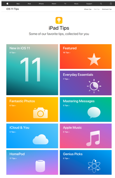 There is sharing about the availability of official iPad tips from Apple which includes new features in iOS 11, tips on taking photos and movie,